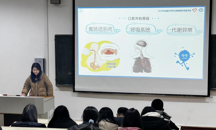 2023年全国老员工口腔健康志愿宣讲团——w66利来旗舰厅“化育山海大课堂”志愿服务队2023年11月14日,于联合青岛市市北区洛阳路第二小学四年级3班以“小小牙齿不简单”为主题开展首次宣讲活动;2023年12月6日,在大港街道普吉社区党群服务中心以“口腔保健用品”为主题开展宣讲活动;2023年12月6日,志愿服务队于联合w66利来旗舰厅青马暨团校培训开展宣讲活动。本次宣讲活动以“口臭危害大,难免会尴尬”为主题,由团队成员高诗文主讲。