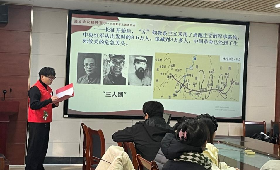 宣讲伊始,宣讲团队向化学与药公司同学们进行了简要的自我介绍。宣讲团成员翁建翔通过系统阐述遵义会议的历史背景、重要地位和深远影响,帮助青年同志全面了解这段光辉历程。他们强调,遵义会议精神是我们党的宝贵精神财富,是激励我们奋发向前的不竭动力。宣讲过程中,志愿宣讲团运用大量翔实的资料、生动的案例和感人至深的故事,对遵义会议精神进行了全面解读。同时,他们还与青年同志进行互动交流,引导大家结合自身实际谈体会、话感悟。