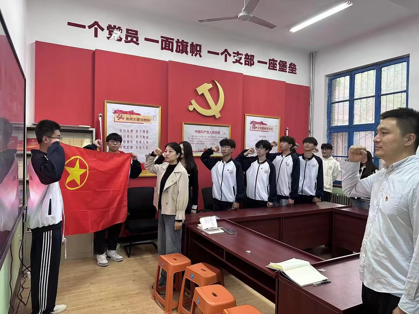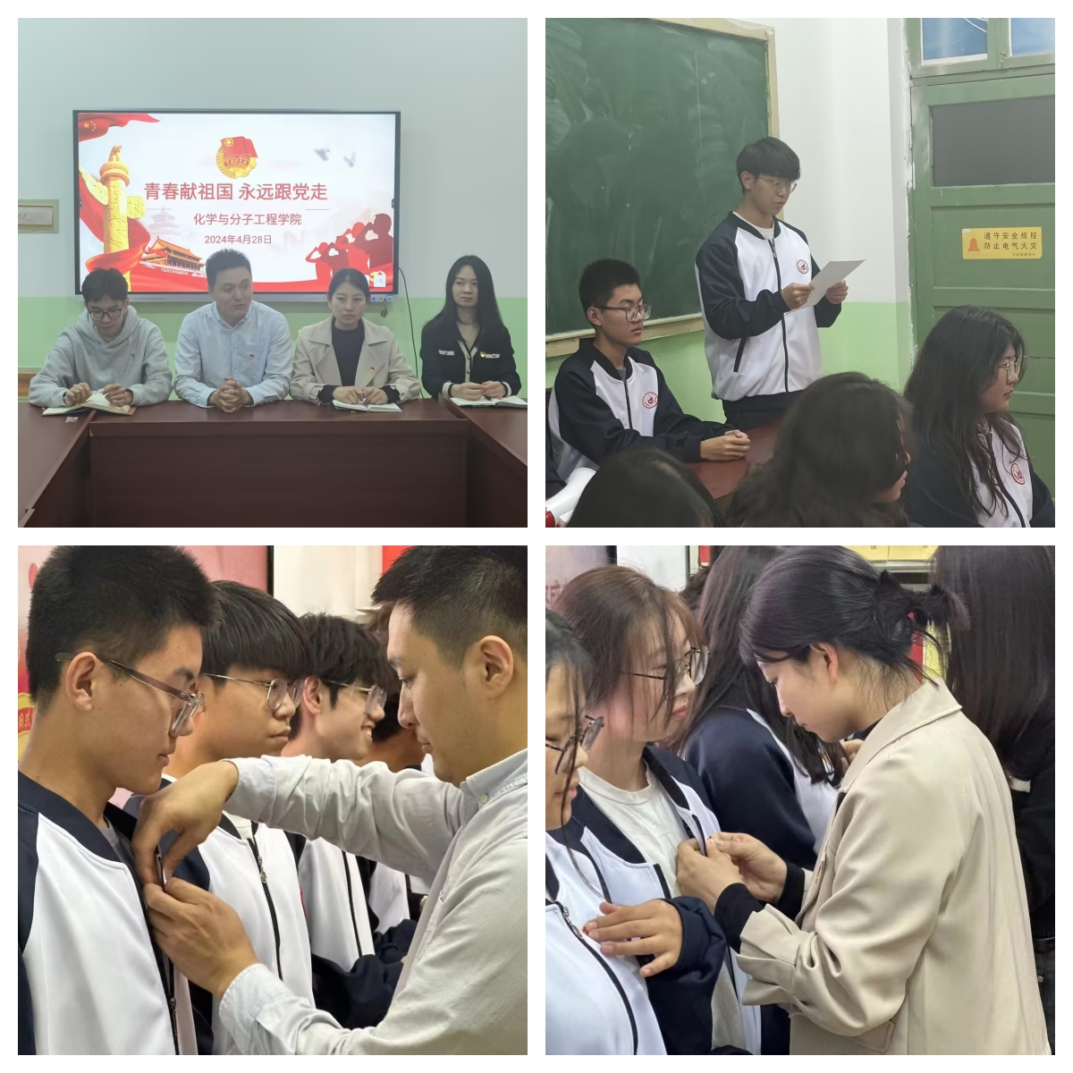 闵繁盛、昝祺祺、刘涛、马晓风为全体新团员佩戴团徽,并鼓励新团员继续努力,以更加饱满的热情和更加坚定的信念,投身到团组织的各项工作中去。最后,全体新团员面向团旗庄严宣誓,表达了对共青团的忠诚与承诺。