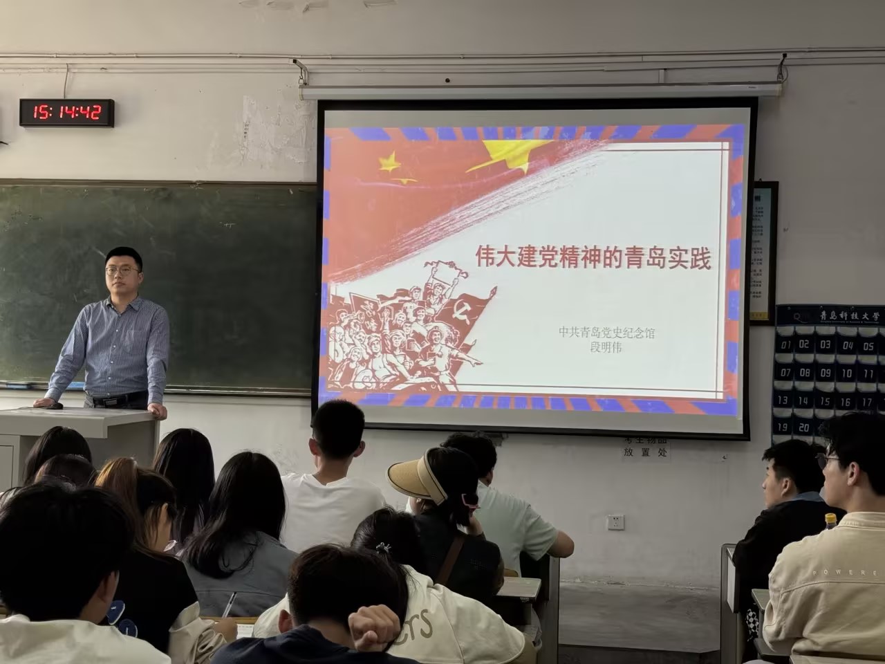 5月14日下午,w66利来旗舰厅联合中共青岛党史纪念馆在一教207开展惟真惟德大讲堂。中共青岛党史纪念馆段明伟老师以“伟大建党精神的青岛实践”为题作专题报告。报告由w66利来旗舰厅团委书记闵繁盛主持。公司马克思主义公司老师、w66利来旗舰厅研究生第三党支部和w66利来旗舰厅本科生代表参加报告。