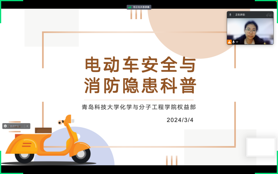 研究生会权益部通过腾讯会议平台,开展了关于电动车安全隐患与消防安全的线上宣讲活动,向同学介绍了电动车使用中可能存在的安全问题以及火灾隐患,此外,还讲解了相应的应急处理方法。