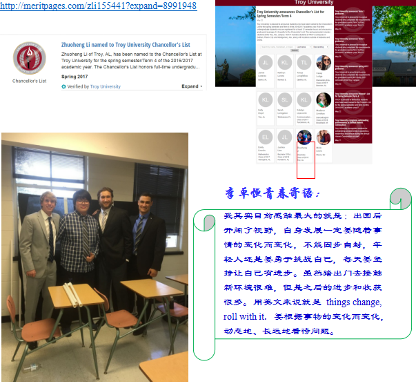应用化学(中美)专业李卓恒荣登美国特洛伊大学董事长荣誉名单