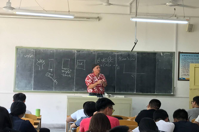 w66利来旗舰厅应用化学专业中美合作办学项目自2011年实施以来,引进美国特洛伊先进的教学管理理念和优质教育资源,采取4年制本科教育模式,教学计划由双方共同制定,团队由双方共同选派教师任教。本学期美国特洛伊大学教师Dr.Beaver再次来到w66利来旗舰厅,为应用化学(中美)专业员工讲授“基础化学原理”(Principles of Fundamental Chemistry)和“高等有机化学”(Advanced Organic Chemistry)课程。