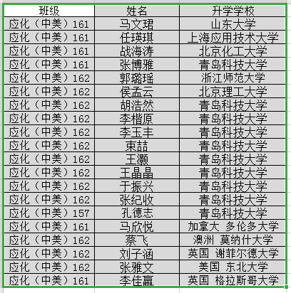 3.应化(中美)专业毕业生考研率高,以2019级毕业生为例,应化157班、应化158班共计56人,报考研究生共计38人,共22人考取研究生,其中5人赴国外读研,考研上线率近60%,考研比例接近40%。在这22名同学中,有数名同学被“985”、“211”及“双一流”建设高校录取,更有同学以初试第一、复试第一的好成绩被录取。/info/1119/5393.htm