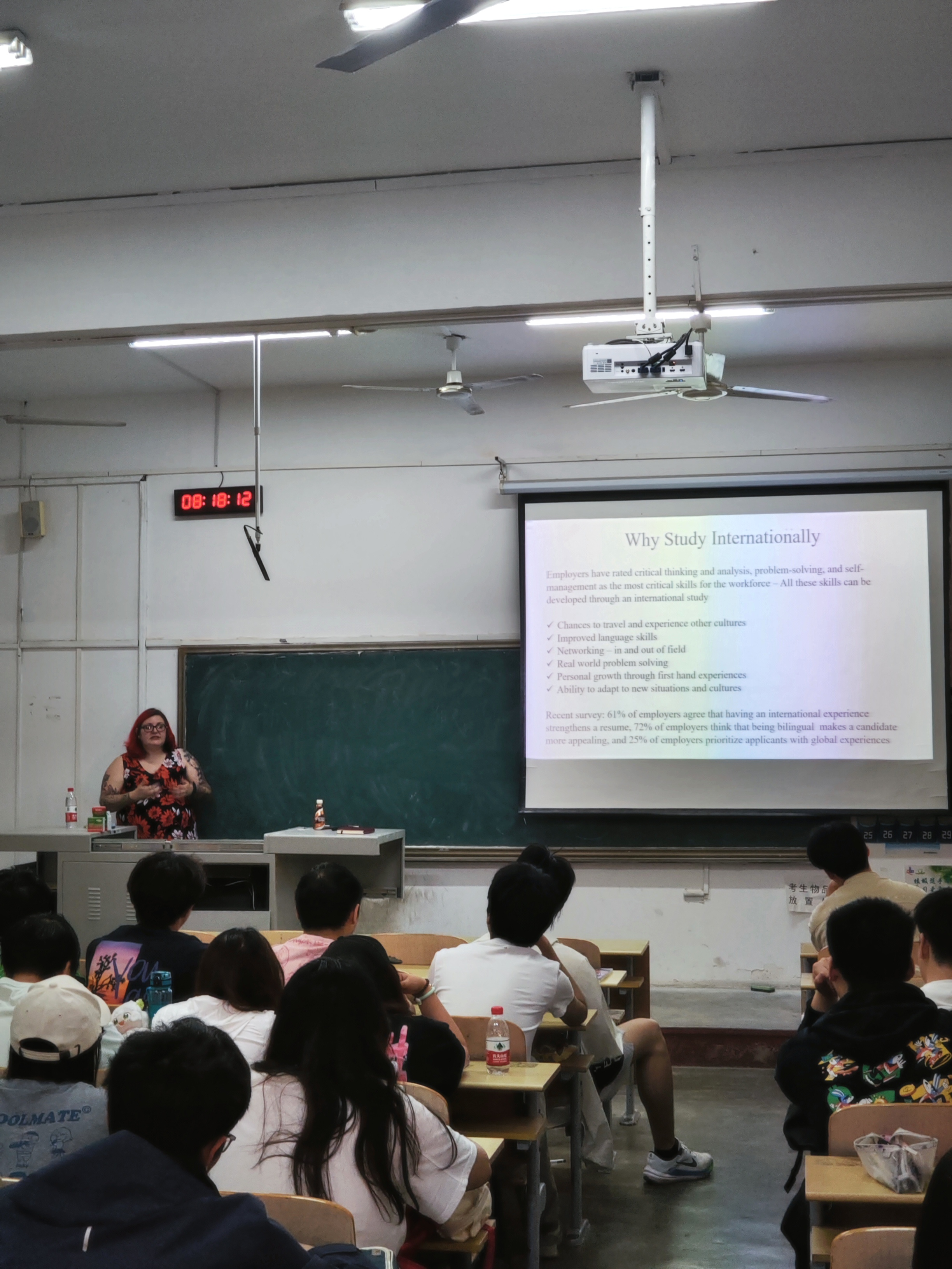 6月6日,公司23级应用化学(中美)专业员工在二教107教室举办了学习交流活动,来自美国的外教Brooke Otten和近60名员工进行了互动交流。